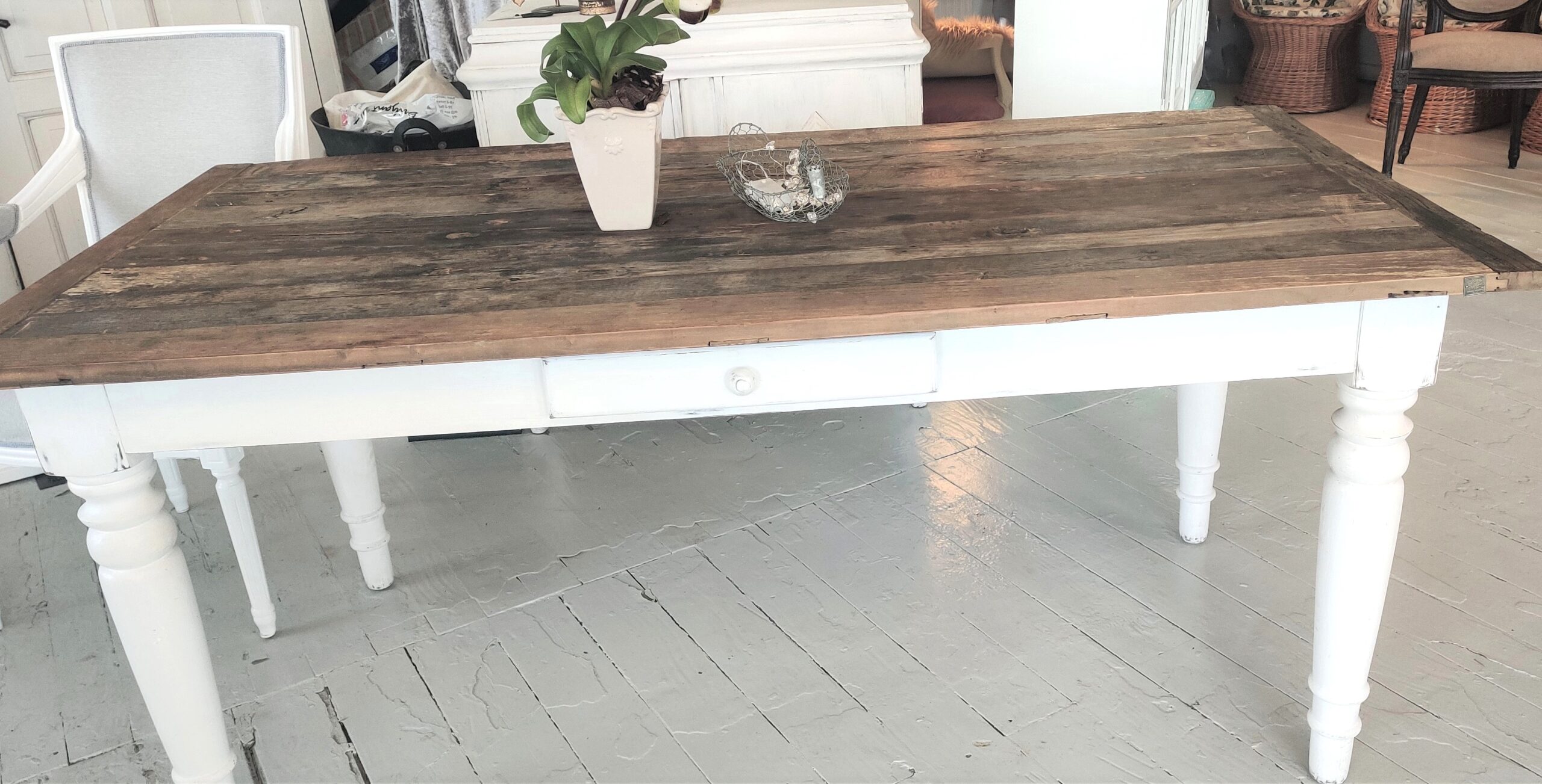 Smukt spisebord med to plader til L: 180/280 cm B: 98 cm H: 76 cm pris kr 1800.- Stolene der er sat til er med fransk flet i ryggen og koster kr 500.- pr stk