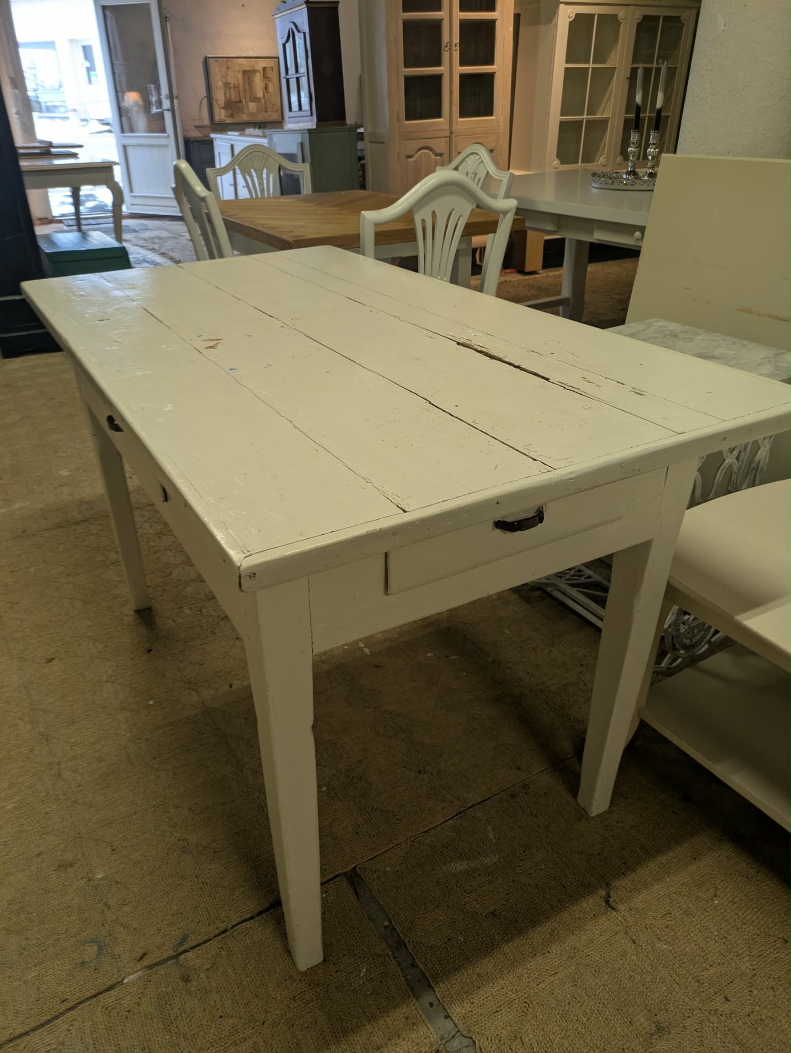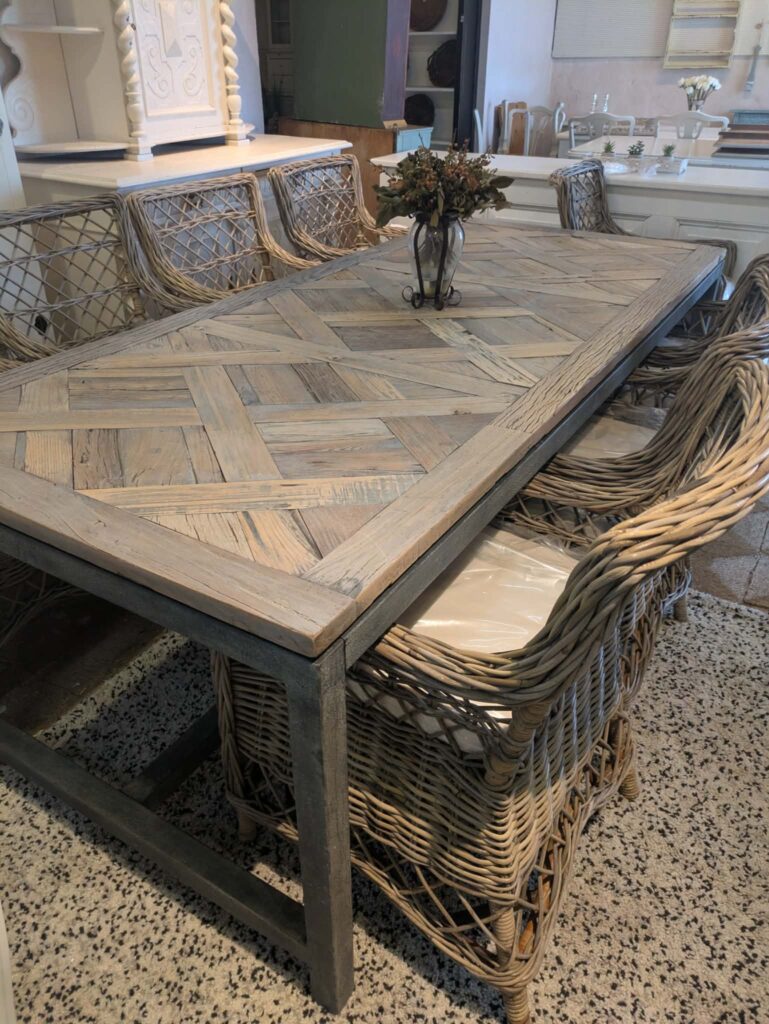 Rustikt stort spisebord, hvor armstole kan skubbes ind under :-) Udført i certificeret genbrugs træ med metalunderstel :-) L: 220 cm B: 97 cm H: 80 cm, pris kr 2900.-