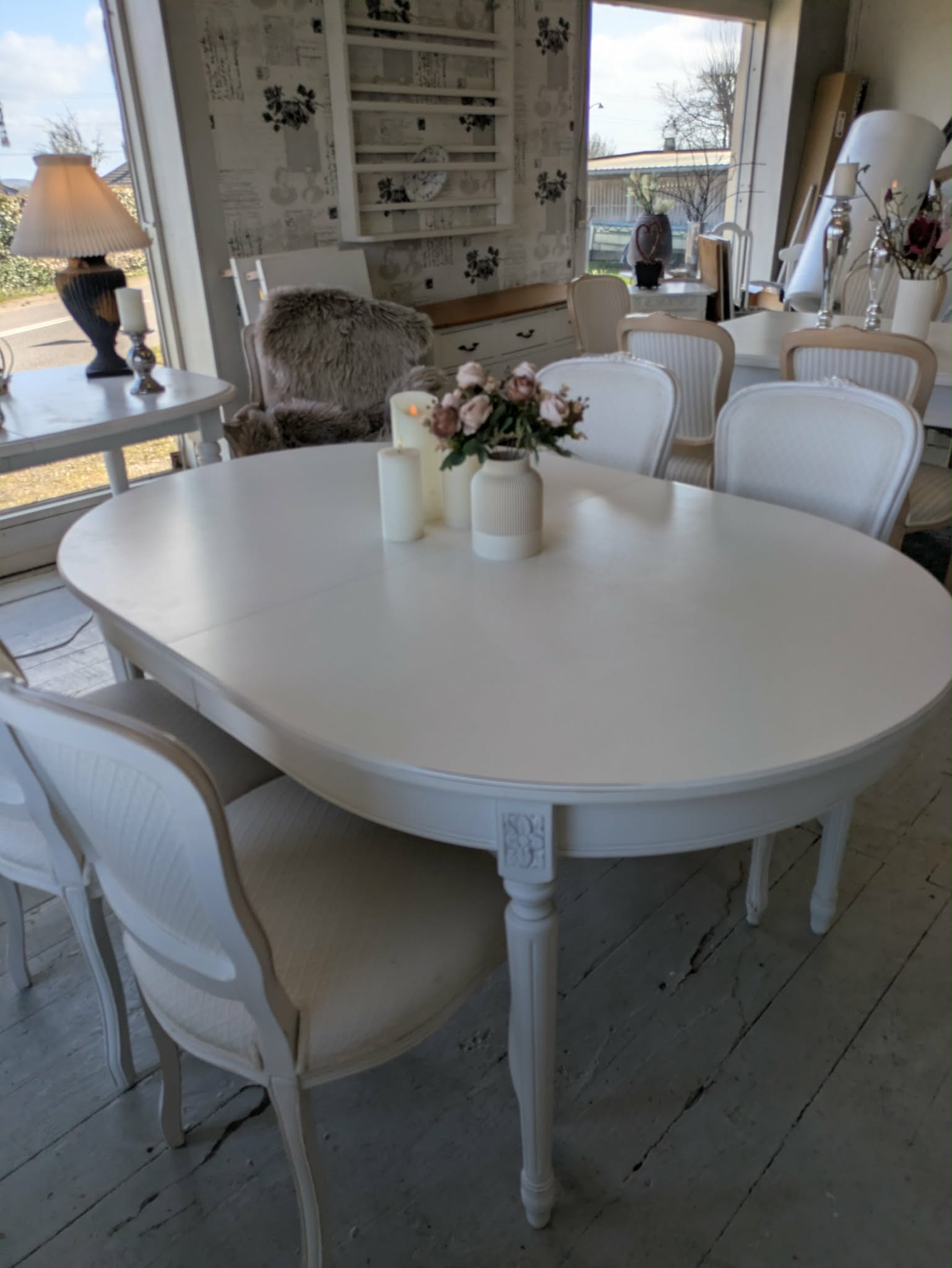 Udgivet den 25. februar 2025Smukt hvidt spisebord Flot spisebord med 2 plader til L: 180/270 cm B: 88 cm H: 76 cm, pris kr 1800.- De 5 flotte stole med nyt fransk betræk koster kr 400.- pr stk.