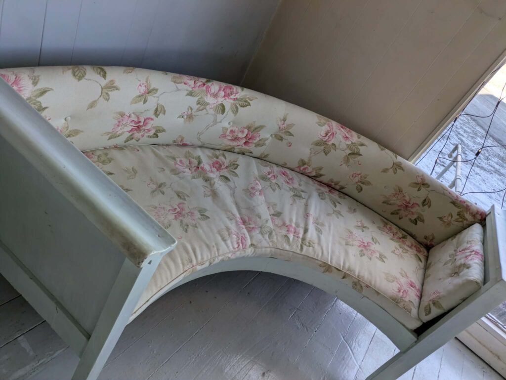 Mål ca fra midten og ud til hver side: 120 cm (240 cm ) sidehøjde: 45 cm D: 55 cm, pris kr 2900.- Bænken er i den originale slidte pastelgrønne farve.